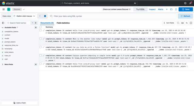 Send your LLM requests, responses, costs, and performance data to Elasticsearch for analytics and monitoring using OpenTelemetry.